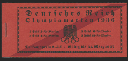 stamps o.g., n.h., fresh and very fine.Michel #MH 42.1, 42.2, 1936 Olympic games booklets, the regular 2M unexploded booklet of two panes and the unexploded booklet with the red diagonal band across the front cover, stamps o.g., n.h., fresh and very fine. (Image) Michel €1,200