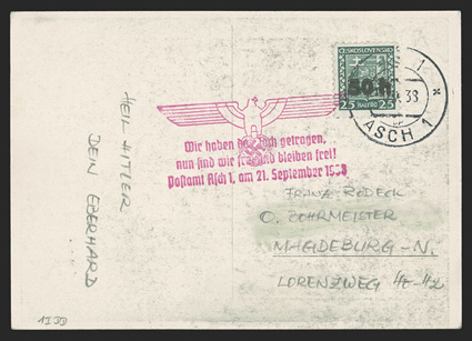 magenta slogan cachet, very fine and rare listed on cover in Michel,Sudetenland - Asch Michel #1 Ia DD, 1938 "60h" surcharge on 25h Blue green, double surcharge, tied to picture post card to Magdeburg by double circle "Asch/10.X.38" datestamp, magenta slogan cachet, very fine and rare; listed on cover in Michel, but not priced; 1993 Osper certificate. (Image) Est. $400-500