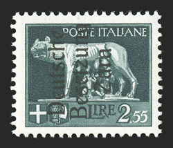 1368 nh Michel 2P Kotor Michel 2P, 1944 1LIT on 25c Dark Green DeutscheMilitarverwaltungKotor trial surcharge in black instead of red, fresh and well centered, o.g., n.h., very fine and rare