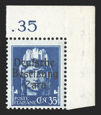 fine the Ty. III overprint only occurs on four positions in the sZara Michel #1-13, 15, 1943 5c-2.55L and 5L "Deutsche/Besetzung/Zara" Ty. III overprints, fresh and well centered, the 35c and 2L top right corner margin singles, o.g., n.h., very fine; the Ty. III overprint only occurs on four positions in the surcharge setting of 100; each signed Raybaudi and 5L accompanied by his 1989 certificate. (imagea) (Image) Michel €3,816
