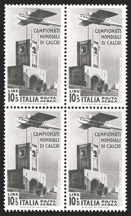 otherwise fine-very fine.#46-50, 1934 10c-10L 2nd World soccer championship cplt., fresh mint blocks of four, o.g., n.h., 10L with tiny adhesion spot on two stamps and a third with a natural inclusion, otherwise fine-very fine. (Image) $2,610.00