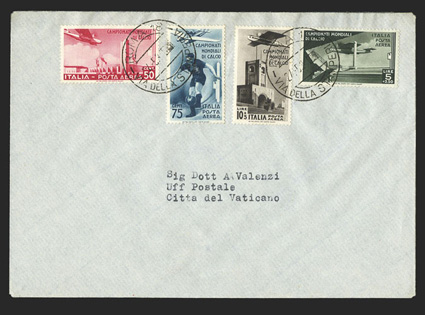 with their arrival backstamp the next day, fresh and extremely fi#C62-65, 1934 50c-10L+5L 2nd World soccer championship, complete set tied by two clear "Roma 18, Via della Stamperi/24.5.34" first day of issue postmark to cover to the Vatican with their arrival backstamp the next day, fresh and extremely fine; cataloged as set on overfranked commemorative cover. (Image) $2,600.00+