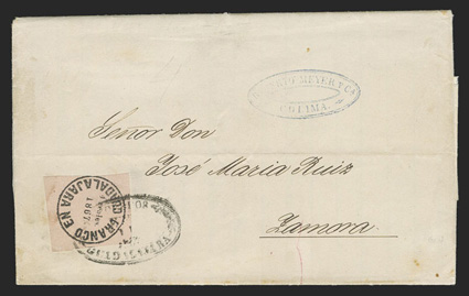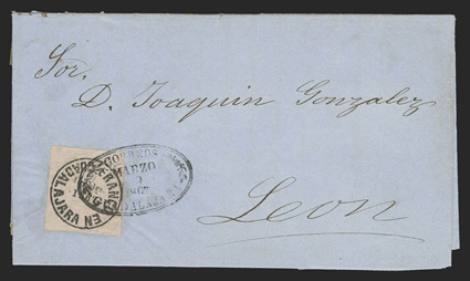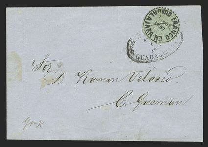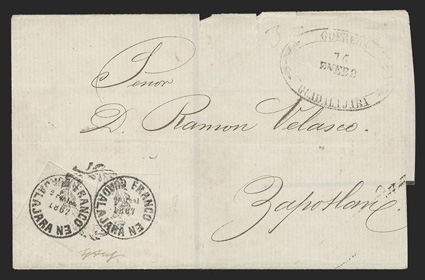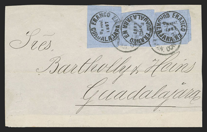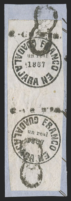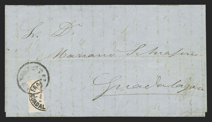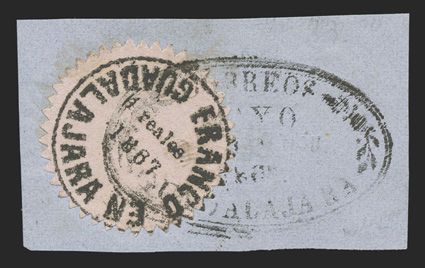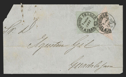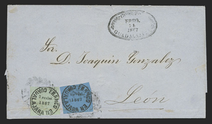 comprised of 89 covers and 55 off-cover items, including mint singles, with aMexico - A highly important collection of Guadalajara Civil War provisional issues, a truly amazing exhibition collection of this notoriously difficult philatelic area comprised of 89 covers and 55 off-cover items, including mint singles, with a surprising number of multiples, used singles, many of which are on piece, sometimes with other values, rare serrated perforations, and ending with the best collection of forgeries ever assembled containing much new original research, all eruditely written up and mounted on exhibition pages.The war between the Liberals headed by Juarez and the Conservatives headed by the Emperor Maximilian divided the country in two. In November, 1866 the Emperor lost control of the Guadalajara region to the Juarez Republicans. In January, 1867 the Guadalajara district postmaster issued his own provisional stamps, since the Maximilian stamps could no longer be used. His region was surrounded by enemies, so he had to make the stamps rudimentarily using a circular cancellation device as the basic design. There was also a scarcity of paper in the city so the postmaster had to buy whatever paper colors and types that he could find. The result was the production of at least 60 different identifiable stamp types in five denominations, often in very small quantities. This local issue was used until the war ended and the Federal government issued new stamps in September, 1868, although covers exist showing usages up to the month of October.The classic Mexico local Provisional issues are comprised of those issued by Chipas, Cuernavaca, Campeche, Chihuahua and Guadalajara and are among the most mysterious and sought-after fields of philately. That is because of their extreme rarity and their primitive design and beauty. Among these provisionals, those of Guadalajara are the only ones with enough different stamp types and covers to build a significant exhibit. While they issued more than 60 different stamps and perhaps as many as 500 covers have survived, all the other Mexican Provisionals only have a handful of stamps and a mere 10-20 covers extant. Of the approximately 500 covers that are believed to exist, only a few exist of most stamps and some stamps are not known to exist on cover.So, how do you end up with more than 60 different types of stamps when making then from a simple canceling device? By a combination of 1) Five denominations - Medio Real, Un Real, Dos Reales, 4 Reales and 1 Peso. 2) Four distinct periods as distinguished by small design changes in the typography of the device used to print the stamps. 3) Eight colors of paper - white, rose, lilac, blue-grey, dark blue, green and dark green. 4) Five types of paper - wove, quadrille, batonne, oblong quadrille and laid. 5) Imperforate and serrated stamps, the latter thanks to a brief experiment which lasted a few weeks and only in Guadalajara City. 6) An overprint used for a few weeks in the small Ciudad Guzman town. 7) A handful of 2 and 4 Reales bisects, and. 8) The printing errors "nu" for "un" and "1863" for "1868."Some selected highlights from the collection include the earliest known usage, a cover franked by 2r Dark green (#5), with oval January 11, 1867 cancel, a mint block of twenty of the ½r on white wove paper (#1), this being the largest known multiple and arguably the most important item of the issue, a 3r combination cover franked by two ½r White (#1) and one 2r Dark green (#5), this being the only recorded combination with a 2r stamp, a cover franked by 1r White (#4) and 2r White (#6), which is the only such combination recorded as well as being the earliest known usage of the 1r stamp, a cover with 1r Dark blue (#3) and 2r Dark green (#5), this being not only the earliest recorded usage of the 4r, but also one of only four recorded examples on cover and the only such combination known, cover front franked by 2r Green (#15) and half of 2r Rose (#18 var.) tied by Guzman cancel, this being the only known 2r Rose bisect and combination, cover with 4r Rose (#7) tied by oval March 29, 1867 datestamp, which is the earliest recorded usage and one of only about 10 covers franked by this stamp, cover franked by 4r Rose (#7) forwarded by agent G.C. Sattler in Colima to his offices in Guadalajara where it entered the mails to Zamora, this being one of only three or four forwarded covers and the only one known with a 4r stamp, a cover franked by a combination of 4r Rose (#7) and 1r Blue on thin oblong quadrille paper (#35), which is in all likelyhood a unique combination, a 5r rate combination cover franked by 4r White (#8) and 1r Blue on oblong quadrilled paper (#35), a rare bisect cover paid by half 4r Rose (#7a) tied by Guzman cancel, of which only 10-12 are thought to exist, cover franked by 4r Rose with "C.-Guzman" overprint (#7b), of which only 3-4 are believed to exist, a cover with one of two recorded examples of 2r Green with double serrate perforations (#14 var.), cover from Zapotlan to Tapalpa with 1r Green on laid batonne paper with "1863" of "1868" error (#42 var.), plus there is an "L" shaped mint block of three showing the error, which is the largest recorded multiple, and lastly, there is a cover franked by a vertical pair of 1r Green on laid paper, both showing the "nu" for "un" error (#47b), this being one of only three recorded covers.This collection contains a very significant number of the 60 different stamp types as well a many rare or uncommon covers. It was formed during a span of twenty years from the amalgamation of several important collections, including those formed by Bash, Dr. Scott and Quintus Fernando and Omar Rodriguez. This collection has won two International Gold Medals, two Reserve Grand Awards and several Gold Medals in the United States and Mexico. It includes many rarities which have not changed hands in a decade or more. Most items have MEPSI certificates, a total of 116 of which accompany