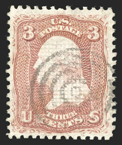 target cancel, very fine a rather attractive example of this ver#85C, 3c Rose, "Z" grill, used, well centered and margined, especially when compared to the existing population of Three Cent "Z" Grills, bright color and a clean impression, light target cancel, very fine; a rather attractive example of this very scarce stamp; 1992 PF certificate. (Image) $3,750.00