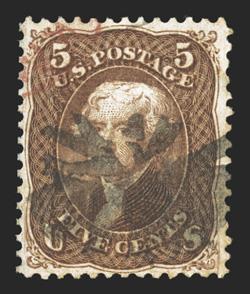 certificates.#95, 5c Brown, "F" grill, exceptionally well centered for this difficult stamp, deep rich color and a highly detailed impression, blue cancel, extremely fine; 2000 and 2006 PF certificates. (Image) $1,025.00