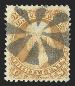 179 O 100 100, 30c Orange, F grill, used, better centering and larger margins than usually found, strong color, neat circle of wedges cancel, very fine 1991 PF