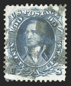 lovely rich color and a clean impression, segmented cork cancel, extreme#101, 90c Blue, "F" grill, a marvelously choice used example of this scarce high value, being especially well centered within much larger margins than typically encountered, lovely rich color and a clean impression, segmented cork cancel, extremely fine; a truly rare stamp in this premium quality; 1996 PF certificate. (Image) $2,400.00