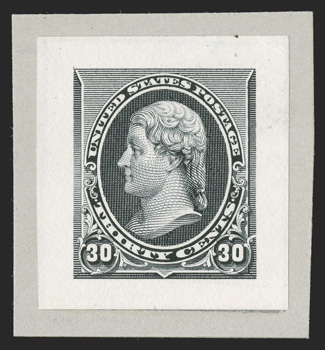 rare and possibly unique proof that is unlisted in Scott, in fact th#221TC1, 3c Black large die trial color proof on India, 63x64mm on card, with American Bank Note Co. imprint and "C-225" at bottom, slight mounting thin, very fine; an extremely rare and possibly unique proof that is unlisted in Scott, in fact there are no trial color proofs of the 3c value listed in Scott; ex-Burrows. (Image) Est. $750-1,000