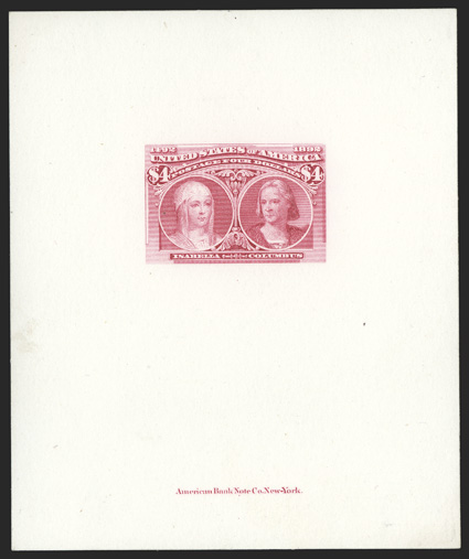 colors on remarkably fresh cards, extremely fine an incredibly hands#230P1-245P1, 1c-$5.00 Columbians, large die proofs printed directly on card cplt., each approximately 84x101mm, with American Bank Note Co. imprint at bottom, beautiful bright colors on remarkably fresh cards, extremely fine; an incredibly handsome set. (imagea) (Image) $4,725.00