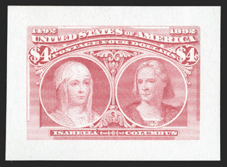 to have been produced 2004 PSE certificate.#223P2a, 6c Red brown, "Panama-Pacific" large die proof on yellowish wove, large balanced margins, rich color on untoned paper, very fine and choice; no more than five are thought to have been produced; 2004 PSE certificate. (Image) $1,100.00
