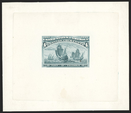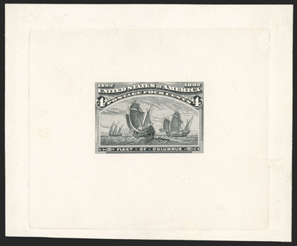 important essay of the Columbian issue, not only being a lovely wat#234-E1, 5c Black brown, engraved vignette mounted on watercolor drawing of unadopted frame on thick artist's card, block sunk as a die essay, 81x78mm, quite fresh, very fine; an important essay of the Columbian issue, not only being a lovely watercolor drawing of the first essay for the Five Cent value, but it is also the only such example ever made. (Image) $4,000.00