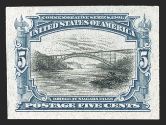 incredibly rare and possible unique Scott does not list any trial#297TC, 5c Dark blue and black, trial color proof on proof paper, in a dark blue shade quite distinct from the issued color, large balanced margins, crisp impressions, very fine; incredibly rare and possible unique; Scott does not list any trial color proofs for the Five Cent Pan-American; 1986 PF certificate. (Image) Est. $1,000-1,500