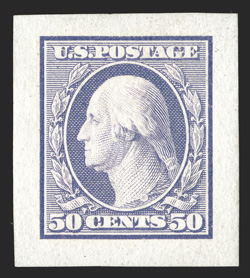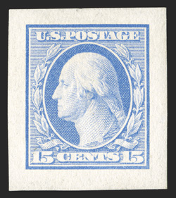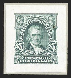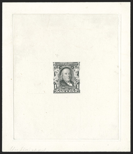 in the top margin, very fine this regular issue series, like the 19#331P2-342P2, 1c-$1.00 Washington-Franklins, small die proofs on wove, uniformly large margins throughout, especially fresh colors, three low values with tiny translucent specks in the top margin, very fine; this regular issue series, like the 1904 Louisiana Purchase and later commemoratives, came out after the Roosevelt books were assembled, but a very limited number were issued, apparently with the intent of keeping the books up to date with new issues, unlike the regularly issued Roosevelt proofs, which were issued in quantities of 85 each, these late issue proofs are considerably rarer and much undercataloged, with perhaps only a half dozen reaching the public; ex-"Chesapeake. (imagea) (imageb) (Image) $8,700.00