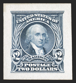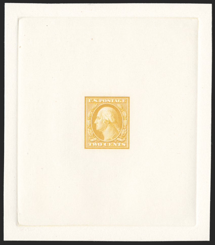 produced.#312P2a, $2.00 Blue, "Panama-Pacific" small die proof on yellowish wove, large full margins with a couple small edge dings at right, strong color, very fine; only 3-5 examples were produced. (Image) $2,500.00
