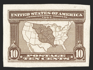 example of this very rare proof 2005 PF certificate.#326P2a, 5c Louisiana Purchase, "Panama-Pacific" small die proof on yellowish wove, large full margins, fresh color on paper that is free of the usual toning, very fine; a choice example of this very rare proof; 2005 PF certificate. (Image) $1,250.00