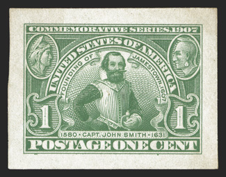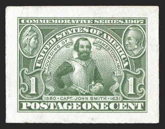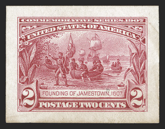 dots at top, 2c with just a faint trace of a translucent spot, very fine#328P2-330P2, 1c-5c Jamestown, small die proofs on wove paper cplt., each with large balance margins, beautiful colors on pristine white paper, 1c with a couple red printing dots at top, 2c with just a faint trace of a translucent spot, very fine; overall a handsome set of these rarely offered proofs. (imagea) (imageb) (Image) $2,700.00