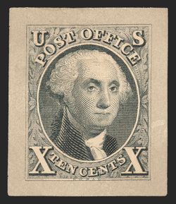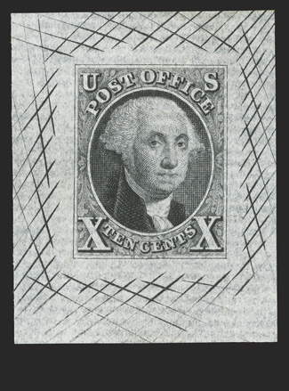 fine.#2TC1, 10c Washington, large die trial color proof in Dark green on India, 51x64mm die sunk with cross-hatching, bright color, shallow thin at top, otherwise extremely fine. (Image) $1,000.00