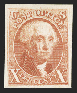 size trial color proof ex-Chesapeake.#2TC1, 10c Washington, large die trial color proof in Light brown on India, 53x64mm die sunk with cross-hatching, lovely fresh color, extremely fine and choice; a beautiful full size trial color proof; ex-"Chesapeake". (Image) $1,000.00