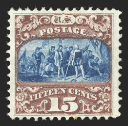 certificates.#119, 15c Brown and blue, Ty. II, lovely rich colors, nicely centered and margined, large part o.g., tiny stain spot in the bottom margin, very fine appearance; 1968 and 1991 PF certificates. (Image) $3,500.00