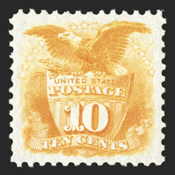 clarity of impression, o.g., lightly hinged, extremely fine a truly gem o#127, 10c Yellow re-issue, an outstanding mint example of this scarce re-issue, possessing impeccable centering amid large balanced margins, vibrant color and an excellent clarity of impression, o.g., lightly hinged, extremely fine; a truly gem original gum Ten Cent 1869 Re-issue; only 1,947 sold; 1992 PF certificate. (Image) $2,000.00