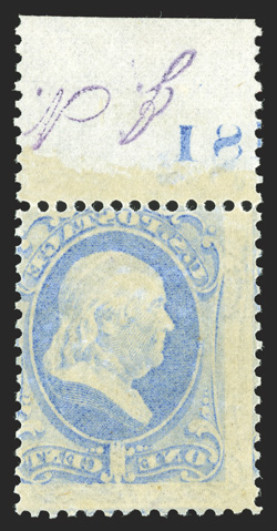 surprisingly elusive mint stamp, particularly in this premium condition 19#145, 1c Ultramarine, especially well centered within uncommonly large margins, brilliantly rich color rich color, full o.g., relatively lightly hinged, extremely fine; a surprisingly elusive mint stamp, particularly in this premium condition; 1990 PF certificate. (Image) $750.00