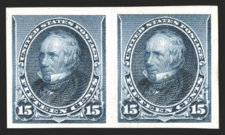 certificate.#227a, 15c Indigo imperforate, horizontal pair, large to extra-large margins all around, deep intense color on fresh paper, o.g., lightly hinged, extremely fine; 1990 PF certificate. (Image) $625.00