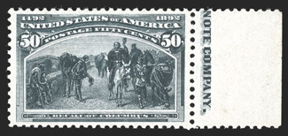 607 og 240 240, 50c Columbian, right sheet-margin partial imprint single, especially well centered within wide margins, sumptuously rich color and a detailed impression, o.g., lightly