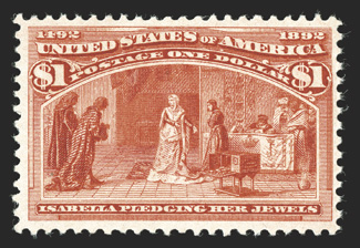 609 nh 241 241, $1.00 Columbian, pristine mint single, with deep fiery color and a vivid impression, attractively centered, o.g., n.h., very fine never hinged examples of the One Dollar