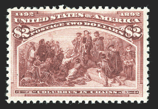 amid lavish large margins which are most uncharacteristic of this value,#245, $5.00 Columbian, an exceptional mint example of this ever-popular high value commemorative, in a quality that places it well above the norm, with outstanding centering amid lavish large margins which are most uncharacteristic of this value, its color and impression further add to this stamp's desirability, o.g., lightly hinged, extremely fine; 1990 PF certificate. (Image) $2,700.00