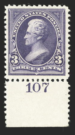 620 nh 253 253, 3c Purple, bottom margin plate no. 107 single, marvelously well centered within unusually large margins, brilliantly fresh, deep luxuriant color, o.g., n.h., extremely