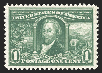 95 SMQ $575.00).#323, 1c Louisiana Purchase, exceedingly well centered and margined, deep rich color and an intense impression, o.g., n.h., an extremely fine gem; 2008 PSE certificate (XF-Superb 95; SMQ $575.00). (Image) $70.00