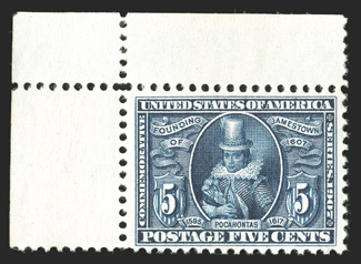706 nh 330 330, 5c Jamestown, top left corner sheet-margin single, exceptionally well centered within unusually wide margins, intensely rich color and a well incised impression, o.g.,