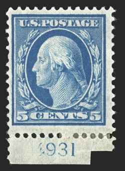 5c is a plate number single, fine-extremely fine. For years these#331 var.-339 var., 1c-13c Washington-Franklins on "China Clay" paper, single of each value on this distinctive paper, o.g. (slightly disturbed on the 4c), three are never hinged, 5c is a plate number single, fine-extremely fine. For years these were listed in the Scott catalog with separate minor numbers (i.e. #331b, 333a, etc.) and realized strong prices when they came up at auction. In fact, the last time they were listed (in the 2006 edition) they carried at total catalog value of $8,600.00 (for hinged). Recent studies of these stamps have shown that they were not made with "China Clay" paper as originally thought, but were produced on a run of paper stock that had become dirty, creating what are now known as the dirty or muddy paper varieties. The editors at Scott took the rather drastic step of completely delisting these, rather than simply renaming them, as they are a quite distinguishable variety - in our opinion these should still carry a minor number listing as before; each is accompanied by at least one PF certificate and several are ex-Saadi or Floyd. (imagea) (imageb) (imagec) (imaged) (imagee) (imagef) (imageg) (imageh) (Image) Est. $2,000-3,000