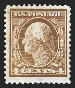 certificate.#334, 4c Orange brown, marvelously well centered within exceedingly large margins, lovely rich color, o.g., n.h. (a couple tiny natural gum skips), extremely fine; clear 1989 PF certificate. (Image) $92.50