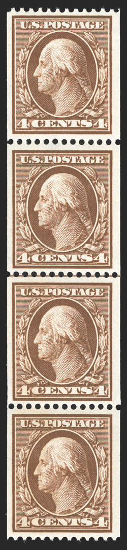 fine-extremely fine a handsome and rare guide line strip 1990 PF ce#350, 4c Orange brown coil, perf. 12 horiz., guide line strip of four, well centered within large margins, rich luxuriant color on bright fresh paper, pristine o.g., n.h., very fine-extremely fine; a handsome and rare guide line strip; 1990 PF certificate. (Image) $3,450.00+