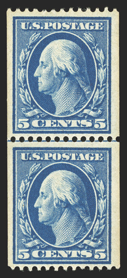 pair 1988 PF certificate.#351, 5c Blue coil, perf. 12 horiz., guide line pair, brilliant color, well centered within wide margins, o.g., n.h., very fine; a desirable example of this scarce guide line pair; 1988 PF certificate. (Image) $2,500.00