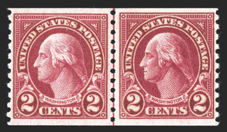 extraordinarily well centered, o.g., n.h., extremely fine as fine a combination#599, 599A, 2c Carmine coil, Ty. I and Ty. II combination joint line pair, a magnificent pair of this, possessing sensational freshness and incredibly intense color, extraordinarily well centered, o.g., n.h., extremely fine; as fine a combination line pair that exists; 1984 and 1991 PF certificates. (Image) $1,250.00