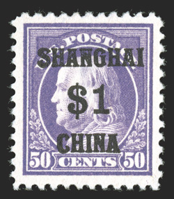 paper, exceptionally well centered within large margins, o.g., barest t#K15, $1.00 on 50c Light violet, an eye-catching mint example, featuring stunning color that is incredibly deep and intense, a truly prooflike impression on brilliantly white paper, exceptionally well centered within large margins, o.g., barest trace of a hinge mark, extremely fine; signed Jakubek and accompanied by a 1984 PF certificate. (Image) $575.00