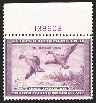 difficult Hunting Permit stamp to find in choice quality.#RW5, 1938 $1.00 Light violet, top margin plate no. 138602 single, exceptionally well centered, lovely rich color, o.g., n.h., extremely fine; a handsome example of the most difficult Hunting Permit stamp to find in choice quality. (Image) $475.00