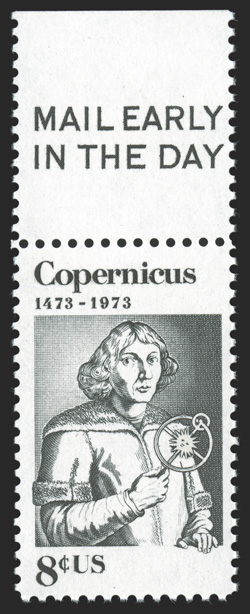 block of four, this being the top left stamp.#1488a, 8c Copernicus, orange omitted, top margin Mail Early single, well centered, o.g., n.h., choice very fine; a desirable example of this rare error; 1991 PF certificate for a block of four, this being the top left stamp. (Image) $775.00