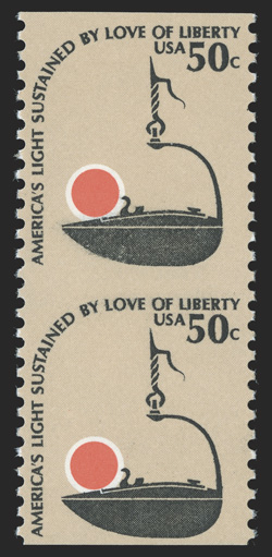 perforations 1988 PF certificate.#1608b, 50c Lamp, Imperforate horizontally, vertical pair, o.g., n.h., very fine; genuine certified examples of this error are very rare, as the majority offered have blind perforations; 1988 PF certificate. (Image) $1,500.00