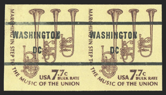 the key rare errors of the Americana series 1991 PF certificate.#1614b, 7.7c Saxhorns coil, imperforate, pair with usual "Washington/D.C." Bureau precancel found on all known imperforate pairs, well margined, o.g., n.h., extremely fine; one of the key rare errors of the Americana series; 1991 PF certificate. (Image) $1,400.00