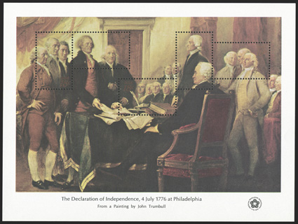 have ever offered 1991 PF certificate.#1687j, 18c Bicentennial souvenir sheet, black omitted, o.g., n.h., very fine; one of the rarest of all the Bicentennial souvenir sheet errors, being the first such example we have ever offered; 1991 PF certificate. (Image) $2,000.00