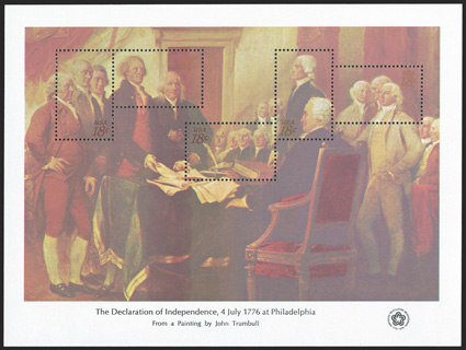 the Bicentennial souvenir sheet errors that are considered unique<#1687r, 18c Bicentennial souvenir sheet, yellow omitted, o.g., n.h., very fine; this is the listing example and the only one recorded to date, being one of only two or three of the Bicentennial souvenir sheet errors that are considered unique; 1988 APS and 1990 PF certificates; listed but unpriced in Scott. (Image) Est. $3,000-4,000