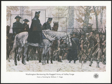 1011 nh 1689r 1689r, 31c Bicentennial souvenir sheet, USA31c omitted from d and e, o.g., n.h., very fine and scarce 1991 PF certificate.#1689r, 31c Bicentennial souvenir sheet, "USA/31c" omitted from "d" and "e", o.g., n.h., very fine and scarce; 1991 PF certificate. (Image) $500.00