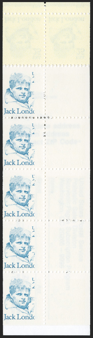 1043 nhBK 2182e 2182e, 25c Jack London, booklet pane of six, all color omitted on right stamps, a single error pane contained in a complete booklet of two panes, the pane also shows the color