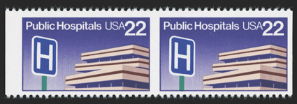 1045 nh 2210b 2210b, 22c Public Hospitals, horizontal pair, imperforate vertically, left margin pair, o.g., n.h., very fine only 20 pairs reported 1990 PF certificate.#2210b, 22c Public Hospitals, horizontal pair, imperforate vertically, left margin pair, o.g., n.h., very fine; only 20 pairs reported; 1990 PF certificate. (Image) $1,150.00