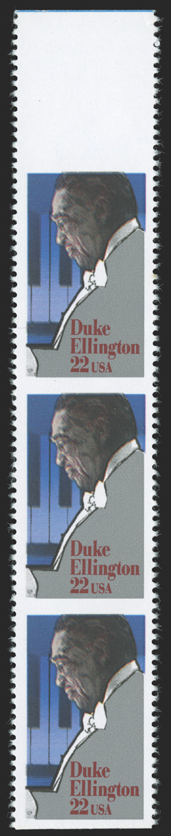 cataloged as a pair.#2211a, 22c Duke Ellington, imperforate horizontally, top margin vertical strip of three, well centered and exceedingly fresh, o.g., n.h., extremely fine; 1990 PF certificate; cataloged as a pair. (Image) $750.00+