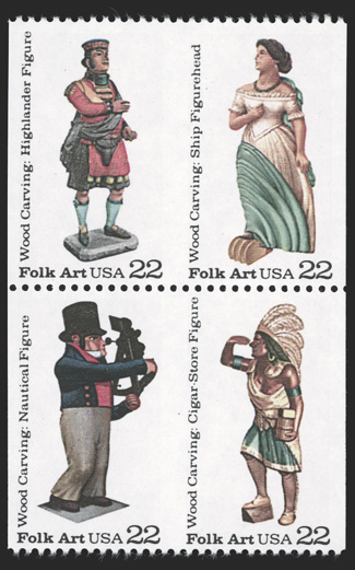 PF certificate.#2243b, 22c Wood Carving se-tenant block of four, imperforate vertically, o.g., n.h., very fine; an especially rare perforation error, with only 20 blocks thought to exist; 1989 PF certificate. (Image) $1,000.00