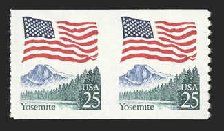 1051 nh 2280f 2280f, 25c Flag over Yosemite coil, imperforate between, horizontal pair, o.g., n.h., very fine 1991 PF certificate.#2280f, 25c Flag over Yosemite coil, imperforate between, horizontal pair, o.g., n.h., very fine; 1991 PF certificate. (Image) $450.00